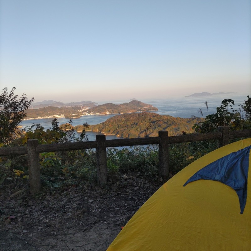 まま、誰もいない貸し切りのキャンプ場へ。眼下に行き交う船の明かり…。
