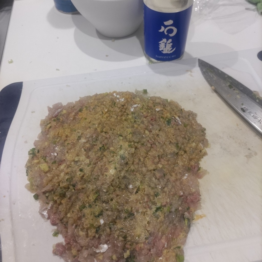これらを混ぜ、アジへの感謝の気持ちとお経のリズムに合わせて包丁で