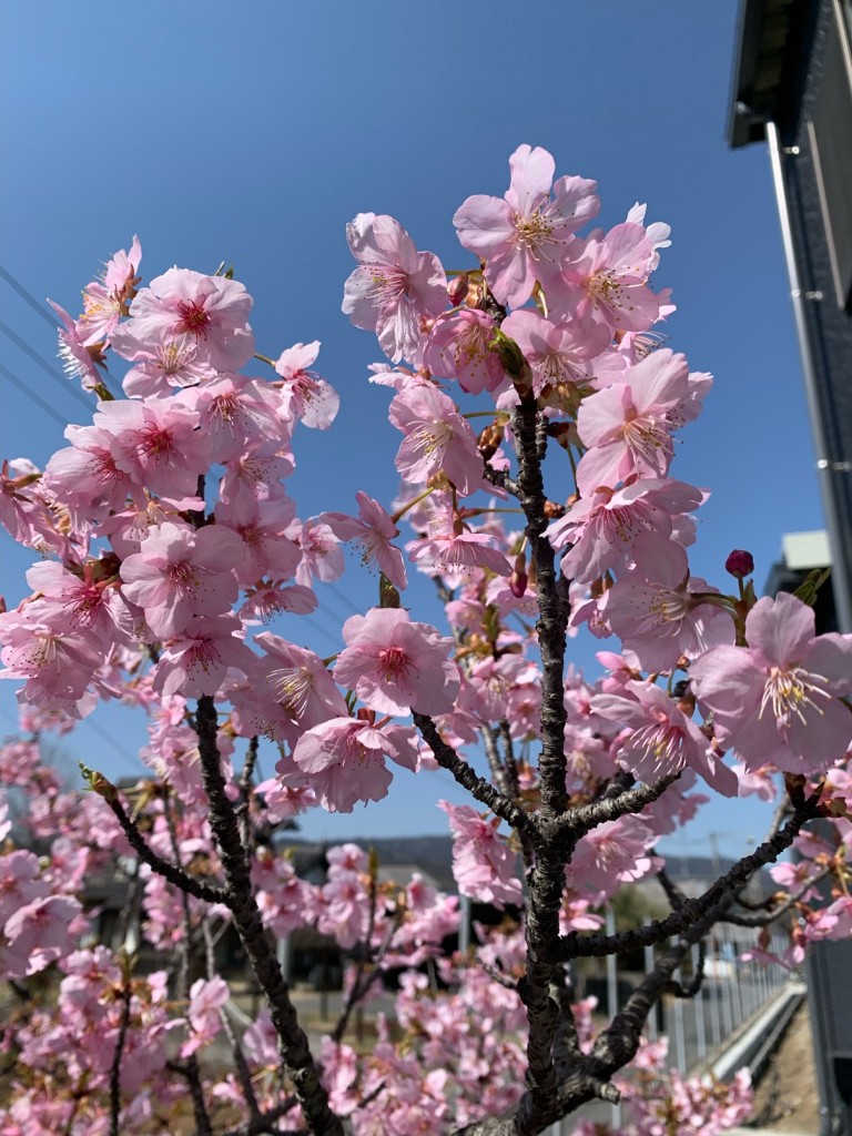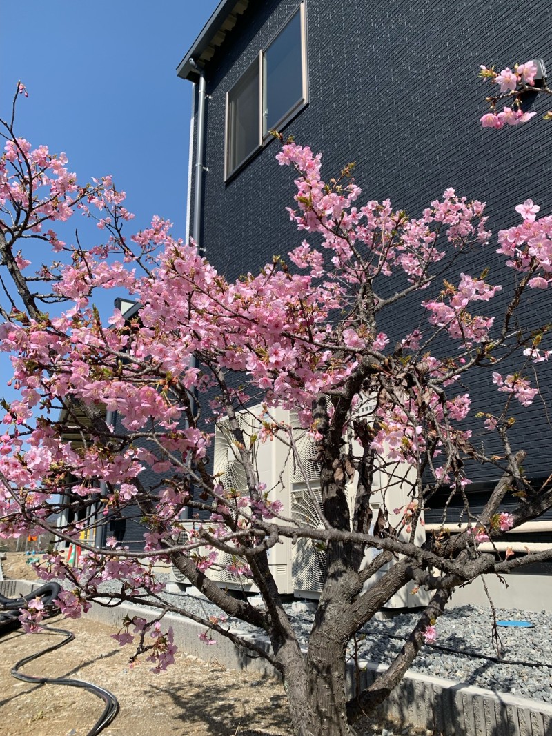 社屋の裏で静かに咲く河津桜。